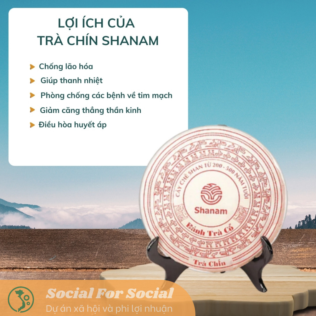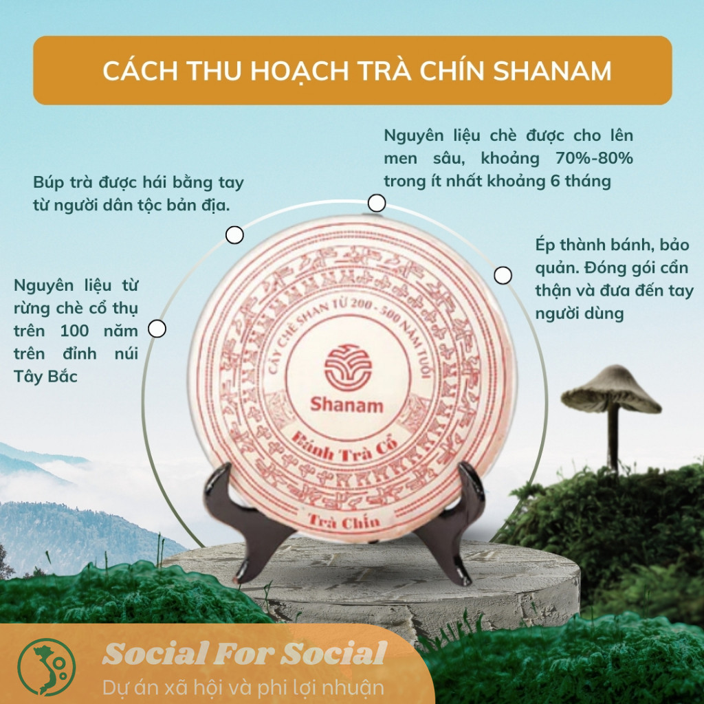 – Cùng là nguyên liệu như trà sống – sử dụng giống trà Shan Tuyết Cổ Thụ hoang dã ở vùng nguyên liệu Shanam khai thác là Tà Xùa, Bắc Yên, Sơn La người làm trà Shanam cho trà lên men, đem ép bánh, hợp dùng thường ngày cải thiện sức khỏe, thúc đẩy trao đổi chất trong cơ thể.