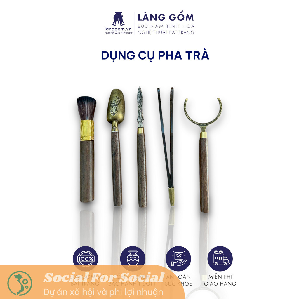 Bộ dụng cụ pha trà – Bộ cung nhãn bằng đồng, gỗ mun đen – Phụ kiện trà đạo chuyên nghiệp – Làng Gốm