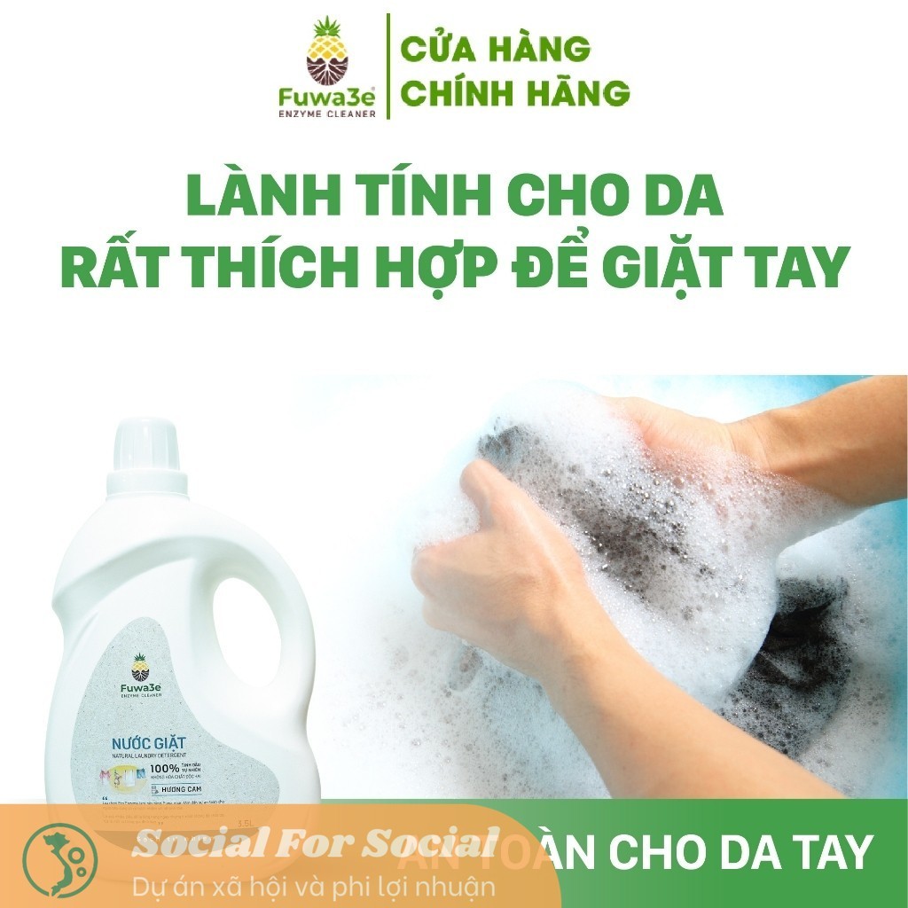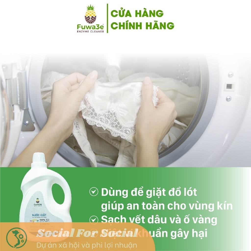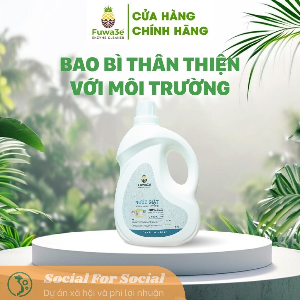Là nhà sản xuất nước giặt tự nhiên có thành phần chính được lên men từ DỨA: các acid hữu cơ và enzyme làm nhiệm vụ phân tách chất bẩn. Ngoài tiêu chí đảm bảo giặt sạch, thơm, nước giặt Fuwa3e còn an toàn tuyệt đối, không hại da tay. Đặc biệt rất phù hợp cho quần áo trẻ em.