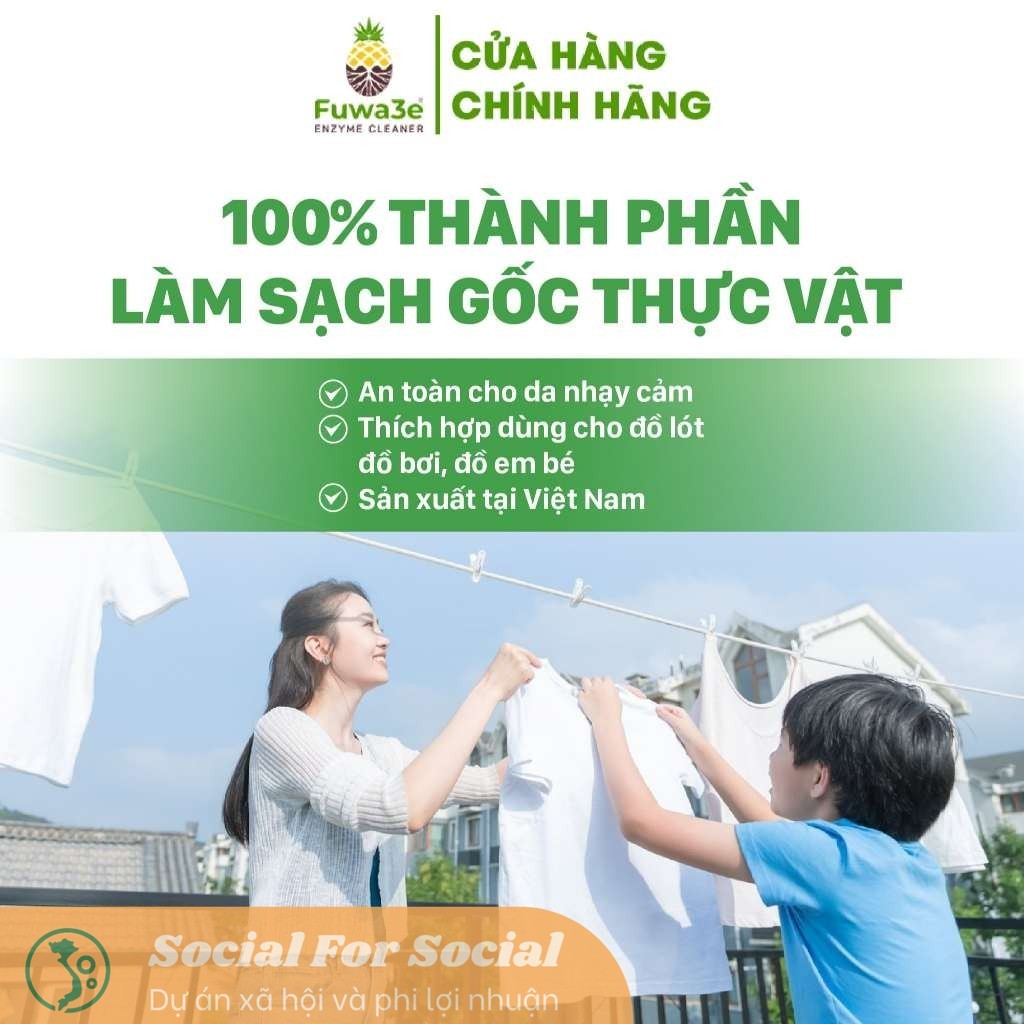 Là nhà sản xuất nước giặt tự nhiên có thành phần chính được lên men từ DỨA: các acid hữu cơ và enzyme làm nhiệm vụ phân tách chất bẩn. Ngoài tiêu chí đảm bảo giặt sạch, thơm, nước giặt Fuwa3e còn an toàn tuyệt đối, không hại da tay. Đặc biệt rất phù hợp cho quần áo trẻ em.