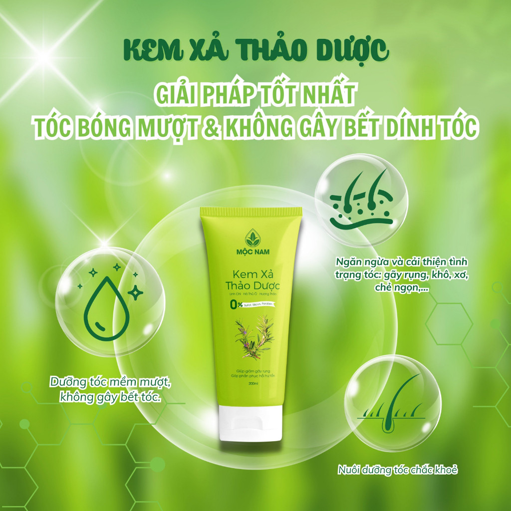 Kem xả thảo dược Mộc Nam được chiết xuất 100% từ thảo dược thiên nhiên, kết hợp công thức hiện đại mang lại hiệu quả dưỡng tóc vượt trội. Sản phẩm giúp mái tóc mềm mượt, óng ả, chắc khỏe mà không gây bết dính, an toàn cho cả da đầu nhạy cảm.