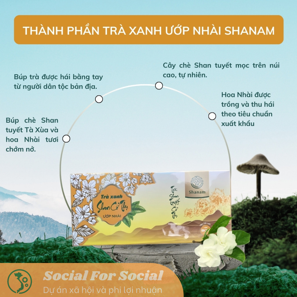Trà Xanh Shan Tuyết Ướp Nhài Shanam là sự kết hợp tinh tế giữa trà xanh Shan Tuyết cổ thụ và hương hoa nhài tự nhiên. Mỗi túi trà là sự giao hòa giữa tinh chất của núi rừng Tây Bắc và hương thơm thanh mát, nhẹ nhàng – lựa chọn hoàn hảo cho những ai yêu trà và quan tâm đến sức khỏe. Sản phẩm phù hợp sử dụng hằng ngày, hoặc làm quà tặng sức khỏe ý nghĩa cho người thân, đồng nghiệp.